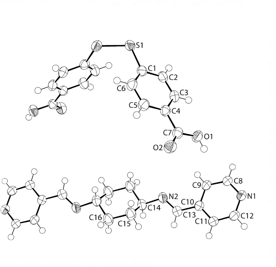 The title co-crystal was prepared through physical mixing of 4-mercaptobenzoic acid (Acros, Geel, Antwerp, Belgium) (0.154 g, 1 mmol) and N,N′-bis((pyridine-4-yl)methylene)-cyclohexane-1,4- diamine [5] (0.292 g, 1 mmol) in a 1:1 molar ratio. Colourless crystals were obtained three days after crystallization by the layering of benzene (2 mL) onto an equivalent volume of DMSO containing the dissolved mixture. M.pt: 438–439 K. IR (ATR, cm−1): 3060(w) ν(N—H), 2940–2826(m) ν(C—H), 1675(m) ν(C=O), 1556(m) ν(C=N), 1321(m) ν(C—N), 815(s) δ(C=C).