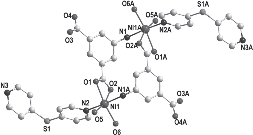 The rational design of metal–organic complexes has received remarkable attention and has developed rapidly due to their fascinating potential applications in functional materials, [4], [5], [6], [7], [8], [9], [10], [11]. All aspects of this research hotspot have been deeply discussed by some recent reviews, which show that the diverse structures of such materials are always dependent on many factors, such as substituent and number of coordination sites provided by organic ligands, ligand to metal salt ratio, template, metal ion, pH value, and counteranion [12]. In recent years, one of our interests focuses on the coordination assembly based on bis(pyridine) ligands and aromatic polycarboxylic acids ligands. In 4,4′-dipyridylsulfide ligand, two pyridine rings can keep different dihedral angles around the sulphur atom in the process of forming a complex. On the other hand, the aromatic polycarboxylic acids can form complexes with metal ions in flexible way, which can enhance stability of the complex [13]. As a continuation of our previous investigation, in this study we reacted 5-aminoisophthalic acid with Ni2+ ions, then employed 4,4′-dipyridylsulfide ligand as an auxiliary ligand, which features di-nuclear structure.
