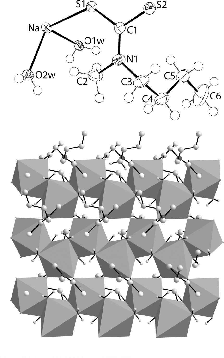 The asymmetric unit of the title salt hydrate is shown in the upper view of the figure (70% displacement ellipsoids; both images show only the major component of the disordered —CH2CH2— residue) and comprises a sodium cation, a n-Bu(Me)NCS2− anion and two water molecules of crystallisation. The NCS2 chromophore is strictly planar (r.m.s. deviation = 0.0035 Å) with the Na [0.2527(9) Å], C2 [0.019(2) Å] and C3 [−0.083(2) Å] atoms lying to either side of the plane. There is a discrepancy in the C—S1, S2 bond lengths [C1—S1 = 1.7434(13) Å and C1—S2 = 1.7178(13) Å] consistent with some localisation of π-electron in the C1—S2 bond. The relative short C1—N1 bond length of 1.3357(17) Å is consistent with a significant contribution of the n-Bu(Me)N+= CS22− canonical form to the overall electronic structure of the dithiocarbamate anion. The distinctive nature of the C—S bonds is reflected in the pattern of bond angles subtended at the quaternary-C1 atom. Thus, the angles involving the S2 atom are systematically wider than the angle not involving this atom [S1—C1—S2 = 120.55(7)°, S2—C1—N1 = 120.69(10)° and S1—C1—N1 = 118.75(10)°]. This contrasts the observation of a recently reported dithiocarbamate salt with an ammonium counter-cation wherein the angles subtended at the quaternary-C1 atom were in the narrow range 119.45(8) to 120.57(10)° [6]. The sodium cation is coordinated by four water molecules as each of the independent water molecules is bidentate bridging [range of Na—O(water): bond lengths: Na—O2w = 2.3278(10) Å to Na—O2wi = 2.4331(10) Å for symmetry operation (i) 1 − x, −y, 1 − z]. The distorted octahedral cis-O4S2 geometry is completed by two S1 atoms [Na—S1 = 2.9502(6) Å and Na—S1 = 2.9641(6) Å for (ii) 1 − x, −1/2 + y, 3/2 − z]. The participation of the S1 atom in two interactions with the sodium cation accounts for the relative lengthening of the C1—S1 bond with respect to the C1—S2 bond (see above). As seen in the lower view of the figure, a two-dimensional layer results from zig-zag chains of edge-shared octahedra linked to neighbouring rows via corner-shared octahedra. The layer assembles in the bc-plane and has a planar topology. Within this framework, water-O—H⋯S hydrogen bonds, involving both sulphur atoms, provide additional stability [O1w—H1w⋯S2iii: H1w⋯S2iii = 2.393(11) Å, O1w⋯S2iii = 3.2301(10) Å with angle at H1w = 172.8(10)°; O1w—H2w⋯S1iv: H2w⋯S1iv = 2.406(12) Å, O1w⋯S1iv =3.2428(9) Å with angle at H1w = 170.5(12)°; O2w—H3w⋯S2iv: H3w⋯S2iv = 2.418(13) Å, O2w⋯S2iv = 3.2407(9) Å with angle at H1w = 168.0(15)°; O2w—H4w⋯S1v: H4w⋯S1v =2.394(15) Å, O2w⋯S1v = 3.2346(9) Å with angle at H1w = 174.7(14)° for (iii) x, 3/2 − y, −1/2 + z, (iv) x, 1/2 − y, −1/2 + z and (v) x, −1 + y, z]. The layers stack along the c-axis direction being separated by hydrophobic interactions, much in the same way as reported recently in the structure of Na2[O2CCH2SC(= S)N(Me)n-Bu]2⋅3H2O [11].