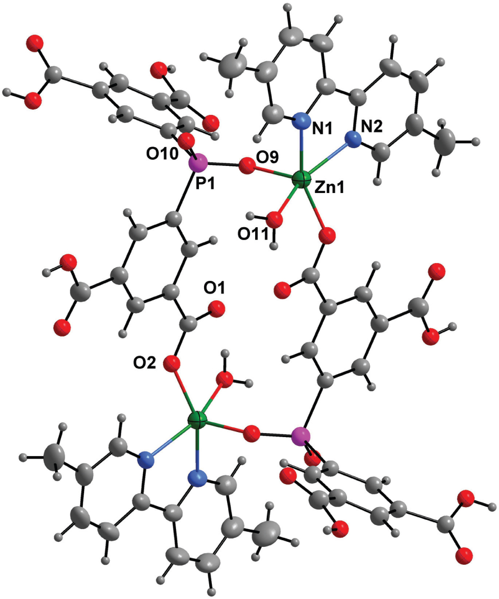 The design and construction of coordination polymers are attracting interest due to their specific structures and potential applications [5], [6], [7]. In order to achieve these goals, it is necessary to select suitable ligands like phosphine oxides [8], [9], [10]. For example, in our previous works, a series of coordination complexes have been obtained by (polycarboxylic phenyl)hypophosphite ligand [11], [12], [13]. Herein, we reported a new binuclear complex [Zn2(H3L)2(bipy)2(H2O)2] (H3L = 3-((3-acetyl-5-carboxyphenyl)oxidophosphoryl)-5-carboxybenzoate, bipy = 5,5′-dimethyl-2,2′-bipyridine).