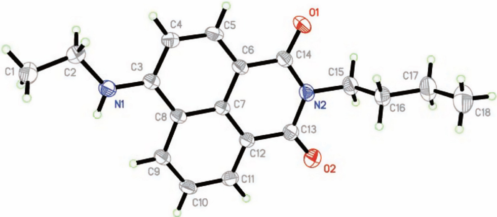 Home Crystal structure of 2-butyl-6-(ethylamino)-1H-benzo[de]isoquinoline-1,3(2H)-dione, C18H20N2O2