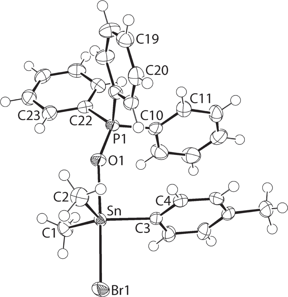 Dimethyldi(4-tolyl)tin (2.0 g, 6 mmol) in dry dimethylformamide (30 mL) was prepared from the reaction of dimethyltin dichloride and 4-tolylmagnesium bromide in a 1:2 molar ratio. A chilled dimethylformamide solution (5 mL) of bromine (0.97 g, 6 mmol) was added dropwise into the solution followed by stirring at room temperature for 1 h. Triphenylphosphine oxide (Sigma-Aldrich, 1.67 g, 6 mmol) in chloroform (25 mL) was added into the mixture which was then refluxed for 1 h. After filtration, the filtrate was evaporated slowly until colourless crystals were formed. These were filtered, washed with a minimum amount of hexane and air-dried. Yield: 0.34 g (62%). M.pt: 398–400 K. Anal. Calc. for C27H28BrOPSn: C 54.23; H 4.69%. Found: C 54.70; H 5.08%. IR (cm−1) 1600 (m) ν(C—C), 1180 (m) ν(P—O), 1087 (s) ν(C—O), 1011 (m) ν(C—O), 485 (w) ν(Sn—O).