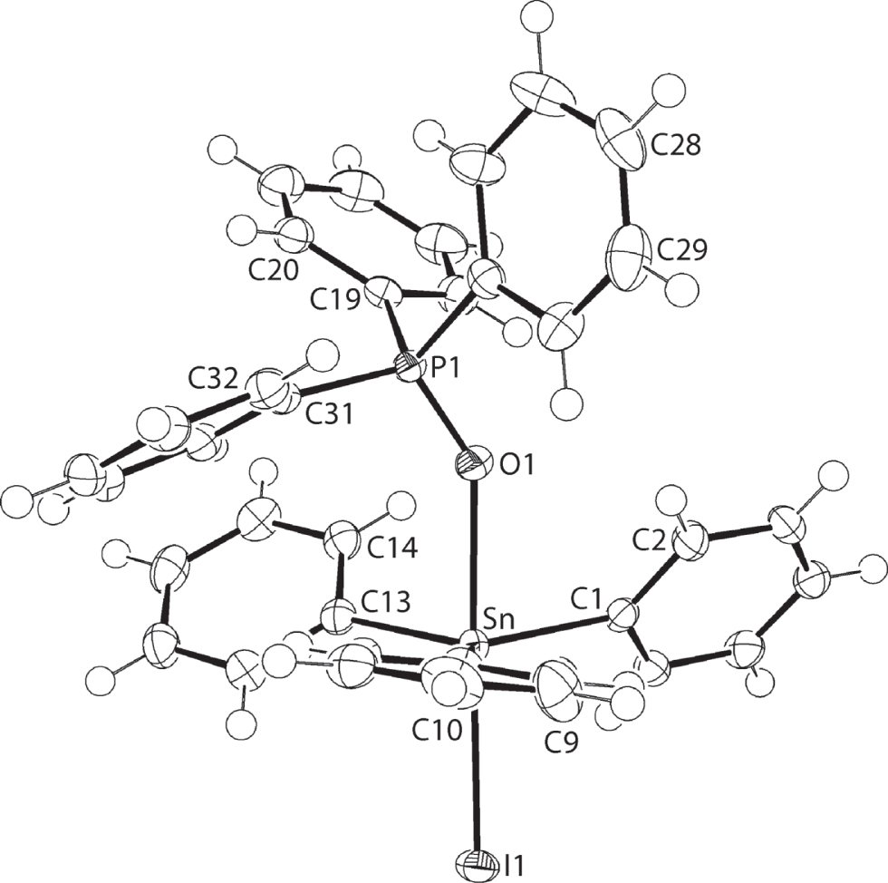 The molecular structure of (I) is shown in the figure (70% displacement ellipsoids). The tin atom exists within a C3IO donor set defined by the three ipso-carbon atoms of the phenyl substituents [range of Sn—C bond lengths: Sn—C7 = 2.122(2) Å to Sn—C1 2.138(2) Å], an iodide [Sn—I1 = 2.8699(2) Å] and the phosphineoxide-O1 atom [2.3517(15) Å]. The resultant penta-coordinated geometry is based on a trigonal bipyramid with electronegative substituents occupying axial positions; the I1—Sn—O1 axial angle is 178.43(4)°. The tin-bound organo substituents occupy equatorial positions with the range of C—Sn—C angles being 117.73(8)° for C1—Sn—C7, to 119.98(8)° for C1—Sn—C13. The Sn atom lies 0.1910(12) Å out of the C3 equatorial plane in the direction of the I1 atom. The P1—O1 bond length is 1.5044(15) Å and the Sn—O1—P1 angle is 146.39(9)°. When the molecule is viewed down the spine, the configuration of the two sets of phenyl rings is staggered, allowing for the bent Sn—O—P angle.