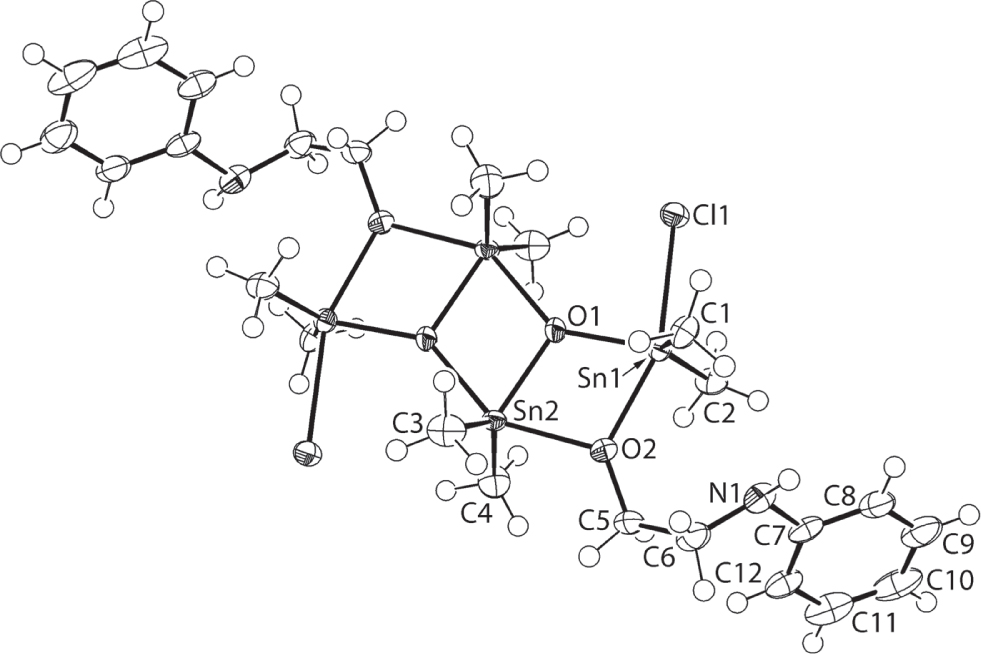 Diorganotin dichloride molecules are well-known to be subject to hydrolysis [5], [6] and it was in this context the crystals of the title tetra-tin oxido-cluster {[(Me2SnCl)(Me2Sn)(OCH2CH2N(H)Ph)]O}2, (I), was isolated. The difficulties associated with hydrolysis notwithstanding, recent work has highlighted the potential anti-tumour activity of related tetra-tin oxido clusters [7], [8], a well-documented attribute of organotin compounds [9]. Herein, the crystal and molecular structures of (I) are described.