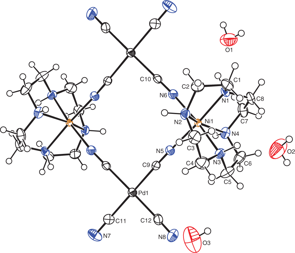 - Crystal structure of cyclo[tetra(μ2-cyanido)-tetracyanido-bis(1,4,7,10-tetraazacyclododecane-κ4N,N′,N′′,N′′′)dinickel(II)dipalladium(II)] hexahydrate, C24H52N16Ni2O6Pd2