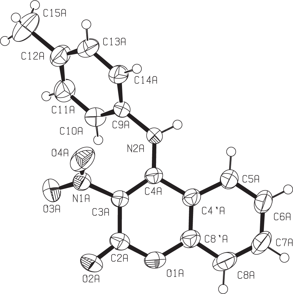 The asymmetric part of the unit cell contains two molecules (A) and (B) of the 3-nitro-4-(p-tolylamino)-2H-chromen-2-one. Bond lengths within the coumarin core of these molecules are in good agreement with those found in other 3-nitro-4-(arylamino) coumarins [10]. The two molecules have very similar conformations, as RMSD of their fit is 0.2417 Å. For both molecules, the coumarin core of the molecule is approximately planar, while both substituent groups at C3 and C4 are turned out from the aforementioned planes. This is visualized through torsion angle C4—C3—N1—O3 (131.55(17)° for molecule A and −141.34(15)° for molecule B) for nitro group twisting, as well as torsion angle C4—N2—C9—C10 (–46.8(2)° for molecule A and 37.7(2)° for molecule B) for the p-tolylamino group twisting.