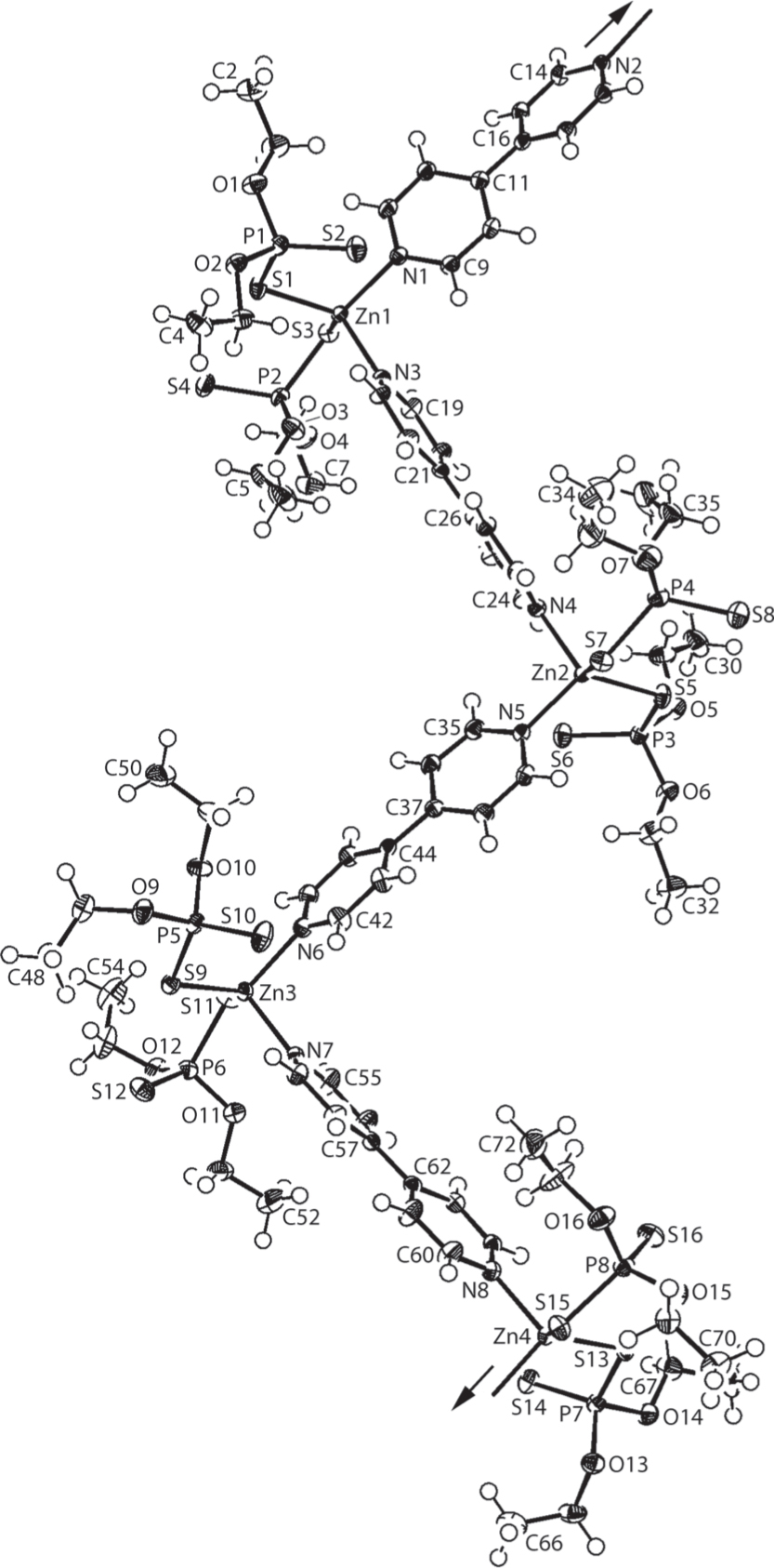 - Crystal structure of a low-temperature (100 K) polymorph of catena-poly[(μ2-4,4′-bipyridine-κ2N,N′)-bis(O,O′-diethyldithiophosphato-κ1S)zinc(II)], C18H28N2O4P2S4Zn