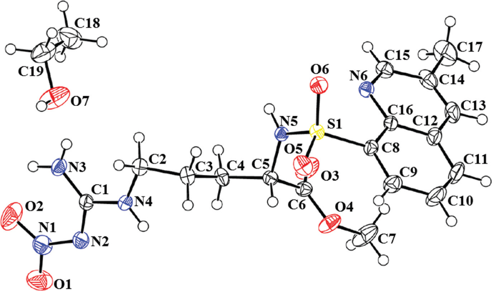 The ethanol solvate was synthesized by the following procedure. An amount of 1 mmol methyl(E)-N2-((3-methylquinolin-8-yl)sulfonyl)-Nω′-nitro-L-argininate was dissolved in a mixed solvent of 5 mL absolute ethanol and 1 mL dichloromethane, then the solution was stayed in room temperature for slow evaporation. Colorless crystals were formed after three days. Yield: 80%.