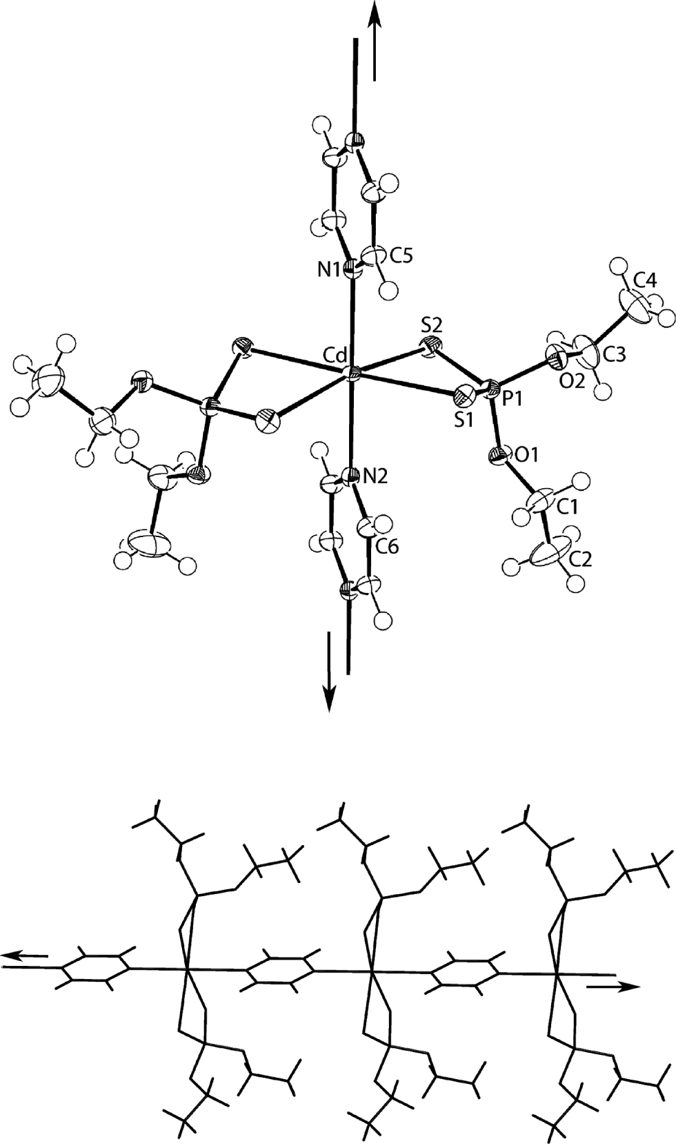 The lower view of the figure highlights the extended one-dimensional coordination polymer which, from symmetry, is strictly linear and aligned along the b-axis direction. A linear coordination polymer was also noted in [Zn(S2COEt)2(pyr)]n [7]. The common feature of both the preceding structures is a trans-N2S4 donor set about the central metal atom. However, in an accompanying report [10], a cis-N2S4 donor set is found in the crystal of {Cd[S2P(O-iPr)2]2(pyr)}n, isolated as a di-acetonitrile solvate, with the result that the one-dimensional coordination polymer formed has a zig-zag topology [10].