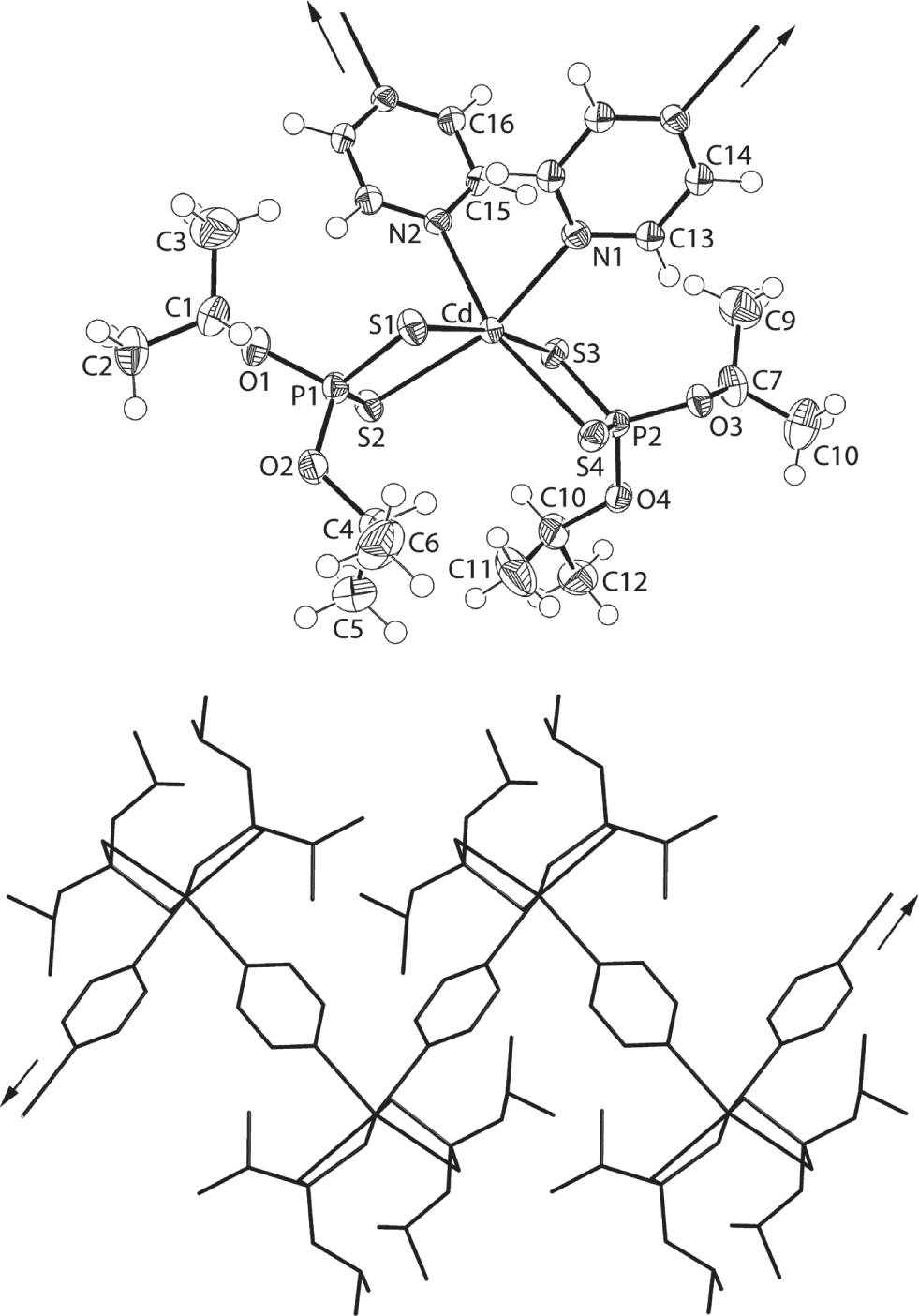 - Crystal structure of catena-poly[(μ2-pyrazine-N,N′)-bis(O,O′-di-isopropyldithiophosphato-S,S′)cadmium(II) acetonitrile di-solvate], [C16H32CdN2O4P2S4⋅2(C2H3N)]n