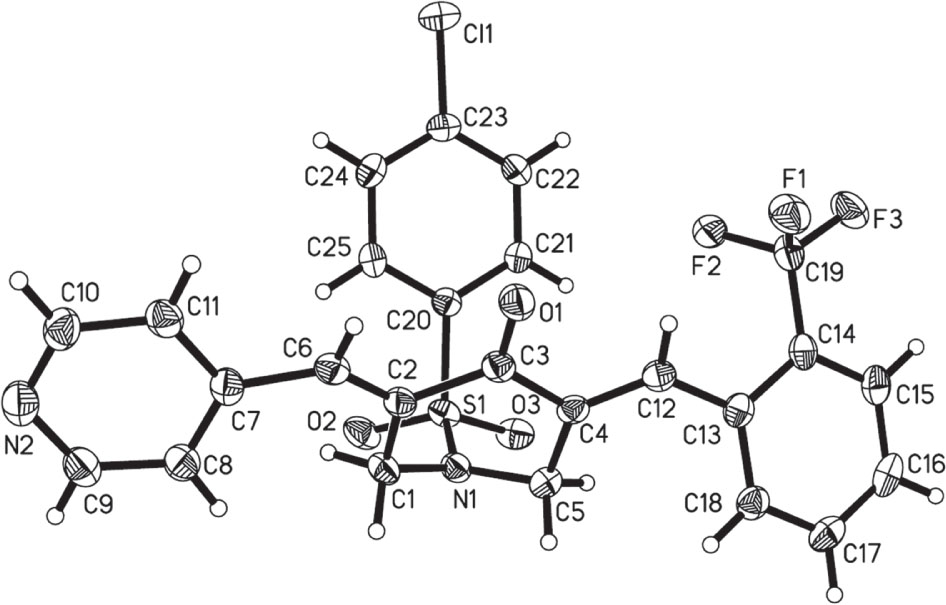 2-(Trifluoromethy)benzaldehyde (1.74 g, 10.0 mmol), 4-pyridinecarboxaldehyde (1.07 g, 10.0 mmol) and 4-piperidone hydrate hydrochloride (1.35 g, 10.0 mmol) were dissolved in dilute acetic acid (25 mL). This mixture was passed through by dry HCL gas for 30 min. After stirring at room temperature for about 24 h (monitored by thin-layer chromatography (TLC)), the precipitate was collected and washed with cold acetone. The precipitates were added into 100 mL water, and then aqueous Na2CO3 solution was added until the pH value was adjusted to about 7. The precipitates were filtered, subsequently washed by water, and purified on silica gel by column using methanol/petroleum ether/EtOAc (1:10:10, v/v/v) as the eluent to afford a yellow intermediate. Next, the intermediate (0.69 g, 2.0 mmol), and 4-chlorobenzenesulfonyl chloride (0.46 g, 2.2 mmol) were dissolved in dichloromethane (50 mL). Two drops of pyridine were added. After stirring for about 6 h at room temperature, the precipitate was collected, washed with water and recrystallized from dichloromethane/methanol (1:1, v/v) to get light yellow crystals of the title compound.