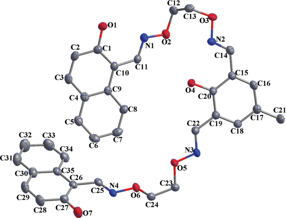 - Synthesis and crystal structure of (1E,3E)-2-hydroxy-5-methylisophthalaldehyde O,O-di(2-((((E)-(2-hydroxynaphthalen-1-yl)methylene)amino)oxy)ethyl) dioxime, C35H32N4O7
