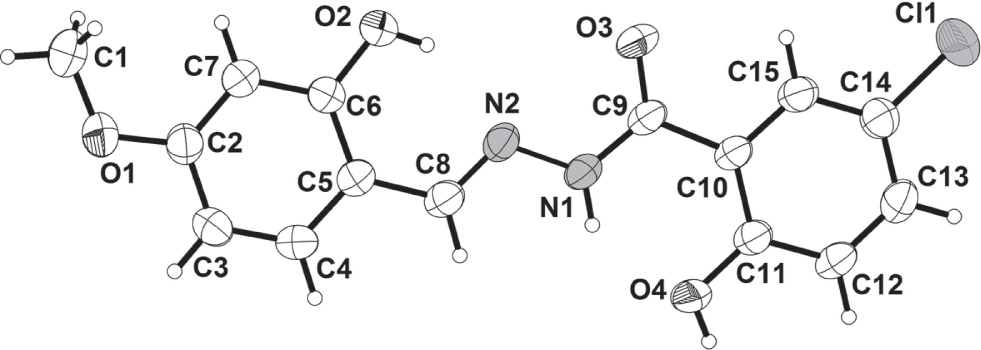 As shown in the figure, the title compound crystallizes in the monoclinic space group P21/c with one molecule in the asymmetric unit. The bond lengths of N2 = C8, N1—C9, C14—Cl1 and N2—N1 are 1.274, 1.333, 1.727 and 1.386 Å, respectively, which are similar with the directly related structures. The atoms O2, O3, N2, are the coordination atoms of the ligand, one ligand will coordinate with three metal atoms. The transition metal complexes have been reported, but the rare earth metal complexes have not been reported, our group will do this job in the future. This sentence was added after [7], [8], [9], [10], [11], [12], [13], [14], [15], [16].