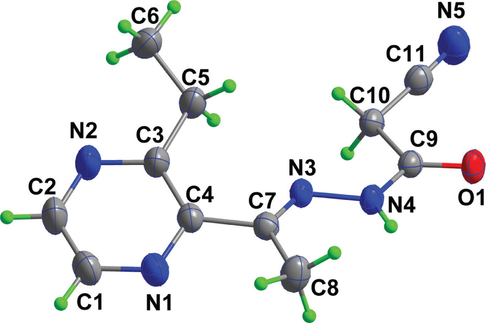 - Crystal structure of (E)-2-cyano-N′-(1-(3-ethylpyrazin-2-yl)ethylidene)acetohydrazide, C11H3N5O