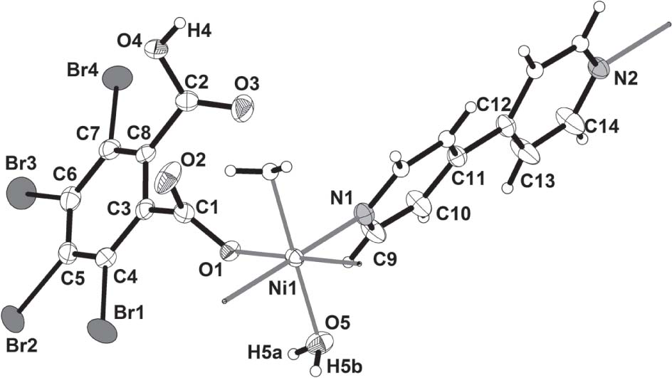 In the title complex, there are half of a Ni(II) ion, one coordinated water molecule, one HBr4ph ligand, and half of 4,4′-bipy ligand in the asymmetric unit (Atoms shown as ellipsoids in the Figure). Ni1 is six-coordinated with a distorted octahedral geometry by two O atoms from two HBr4ph and a pair of N atoms of two 4,4′-bipy ligands, located at the basal equatorial plane, and two coordinated water molecules from the axial positions with a O5-Ni1-O5′ angle of 179.34(15)°. The Ni—N bond lengths are 2.118(4) and 2.131(4) Å and the Ni—O ones are in the range of 2.045(2) and 2.116(2) Å. Ni(II) ions are linked by 4,4′-bipy ligands to form a chain. In the title complex, there are hydrogen bonds: (a) hydrogen bonding between water and carboxylate O atom O2 with d(O⋯O) = 2.61 Å; (b) hydrogen bonding between water and carboxylic group (O3) with d(O⋯O) = 2.73 Å; (c) hydrogen bonding between carboxy O atom O4 and carboxylate O atom O1 with d(O⋯O) = 2.67 Å. The 1-D chains are linked by intermolecular hydrogen bonding to form an extended three-dimensional network. The title structure is directly related with a structure reported in ref. [14] and shows isotypism to a recently reported structure [15].