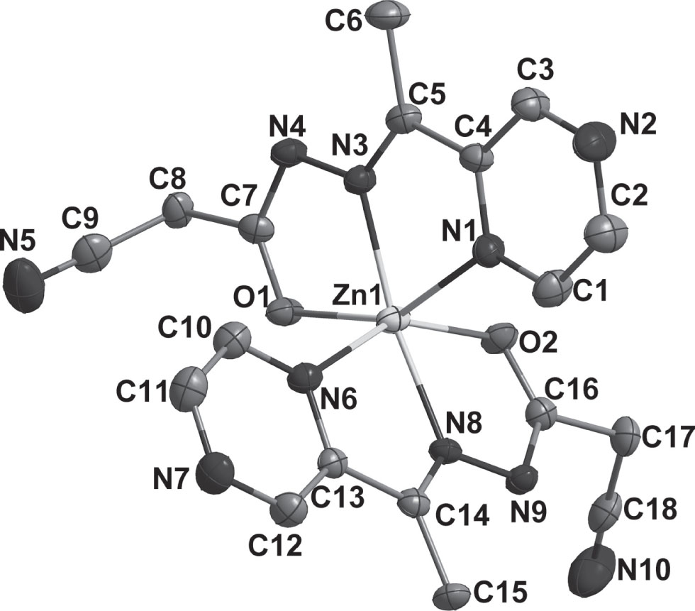 - Crystal structure of bis-[N-(1-pyrazin-2-yl-ethylidene)-cyanoacetic acid-hydrazonato-κ3O,N,N′)]-zinc(II), C18H16N10O2Zn