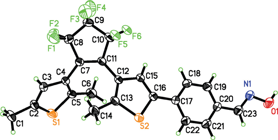 To a stirred solution of 1-(2,5-dimethyl-3-thienyl)-2-[2-methyl-5-(benzaldehyde-4-yl)-3-thenyl)]perfluorocyclopentene [5] (0.24 g; 0.5 mmol) in ethanol (2.5 mL), hydroxylamine hydrochloride (0.035 g; 0.5 mmol) was added and continuously stirred. After refluxing for 5 h, the mixture was cooled to room temperature and concentrated under vacuum. The product was purified by flash chromatography with petroleum ether/ethyl acetate = 4/1 as the eluant to give the title compound with a yield of 75%. The title compound crystallized from hexane at room temperature. Mp. 306–307 K; 1H NMR (400 MHz), CD3CN, TMS): (ppm): 1.80 (s, 3H, -CH3), 1.88 (s, 3H, -CH3), 2.08 (s, 1H, -OH), 2.3280 (s, 3H, -CH3), 6.71 (s, 1H, thiophene-H), 8.95 (d, 1H, J = 4 Hz, = CH-), 7.51 (m, 2H, phenyl-H), 8.01 (d, 2H, J = 4 Hz, phenyl-H), 8.95 (d, 1H, J = 4 Hz, = CH-); 13C NMR (100 MHz), CD3CN, TMS): (ppm): 13.85, 13.96, 14.62, 102.80, 113.62, 114.27, 123.44, 123.89, 124.37, 125.29, 125.55, 126.95, 128.65, 129.84, 134.99, 135.13, 138.17, 139.66, 140.69, 142.10, 154.12.