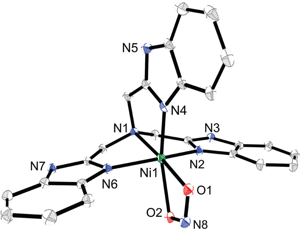 Tris(2-benzimidazolylmethyl)amine (ntb) was synthesized according to the literature method [3]. An ethanol (10 mL) solution of ntb (0.080 g, 0.20 mmol) was added into an ethanol (20 mL) solution of Ni(ClO4)2 ⋅ 6H2O (0.074 g, 0.20 mmol) and sodium nitrite (0.014 g, 0.20 mmol), forming a clear green solution. The solution was stirred for one hour and then filtered. The filtrate was evaporated for three days to form green crystals.