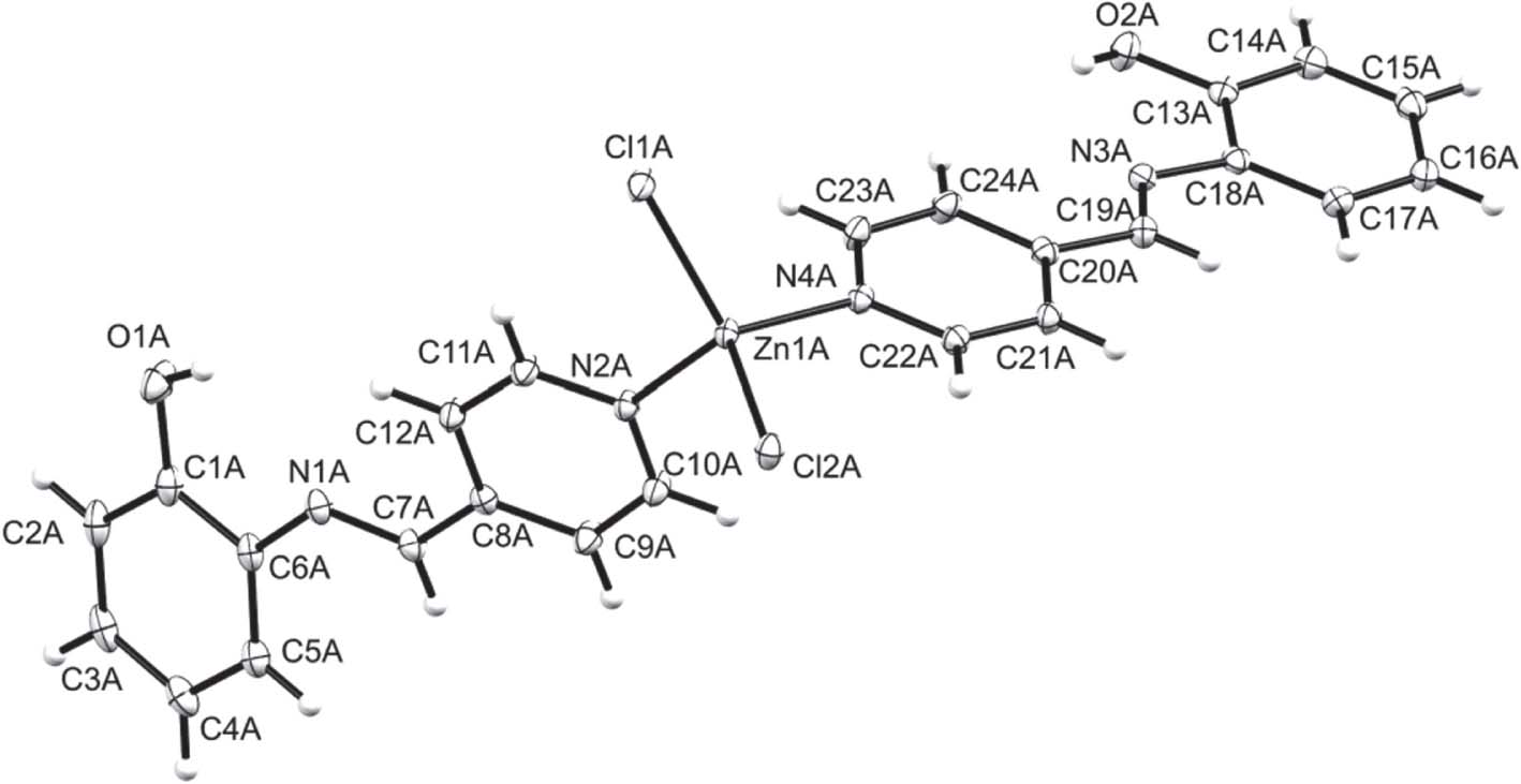 Startseite Crystal structure of dichlorido-bis((E)-2-((pyridin-4-ylmethylene)amino)phenol)zinc(II), C24H20Cl2N4O2Zn