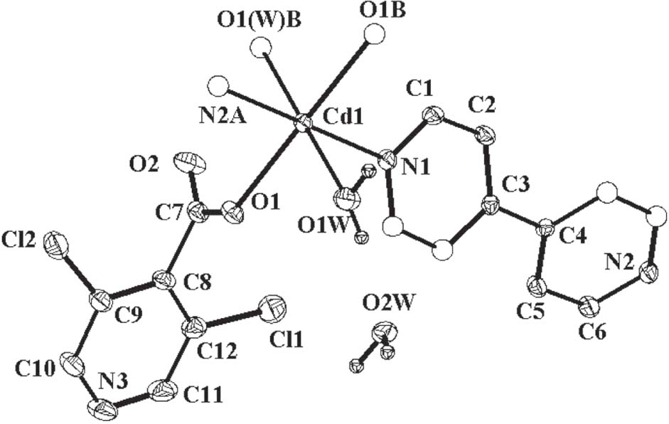 All reagents and solvents for synthesis and analysis were commercially available and used as received. The mixture of 3,5-dichloroisonicotinic acid (dcia) (0.1 mmol, 19.2 mg), 4,4′-bipyridine (bpy) (0.1 mmol, 15.6 mg), Cd(OAC)2 ⋅ 2H2O (0.1 mmol, 26.7 mg) and H2O (6.0 mL) were placed in a 23 mL Teflon liner stainless steel reactor. The vessel was heated to 393 K for 4 days, then cooled slowly to the room temperature. Colorless crystals were obtained, and further crystals were filtered off, washed with mother liquid, and dried under ambient conditions. Yield 46% (based on dcia ligand).