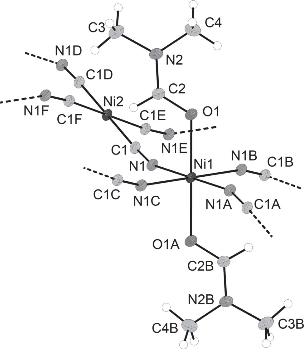 The asymmetric unit of the title compound contains two Ni(II) ions with occupancies of 0.25, one cyanide ion (CN−), a half DMF molecule. It is particularly worth mentioning that the coordinated CN− ions derive not from the addition of the cyano compounds, but from the thermal decomposition of the solvent acetonitrile. Each Ni1 center is coordinated by four cyanide ligands in the equatorial positions and two oxygen atoms from two coordinated DMF molecules at the axial positions to form an approximately regular octahedron geometry (NiO2N4; A = −x + 2, −y + 1, −z + 1; B = −x + 2, y, −z + 1; C = x, −y + 1, z; cf. the figure). Ni1 and four coordinated nitrogen atoms are in the same plane (p1). Each Ni2 center exhibits a four-coordinated square geometry (NiC4; D = −x + 1, −y, −z + 1; E = x, −y, z; F = −x + 1, y, −z + 1; cf. the figure) by four carbon atoms from four cyanide ligands. Ni2 and four coordinated carbon atoms are also coplanar (p2). The dihedral angle between the two planes (p1 and p2) is 146.9(9)° (cf. the figure). The Ni—C, Ni—N and Ni—O bond lengths are 1.866(2), 2.0663(19) and 2.088(2) Å, respectively. The neighbouring Ni1 and Ni2 centers are connected by cyanide ligands to furnish a two-dimensional layered structure. The adjacent layers are further assembled by van-der-Waals forces to extend into a three-dimensional network structure. All bond lengths and bond angles within the title structure are in the typical ranges [20], [21].