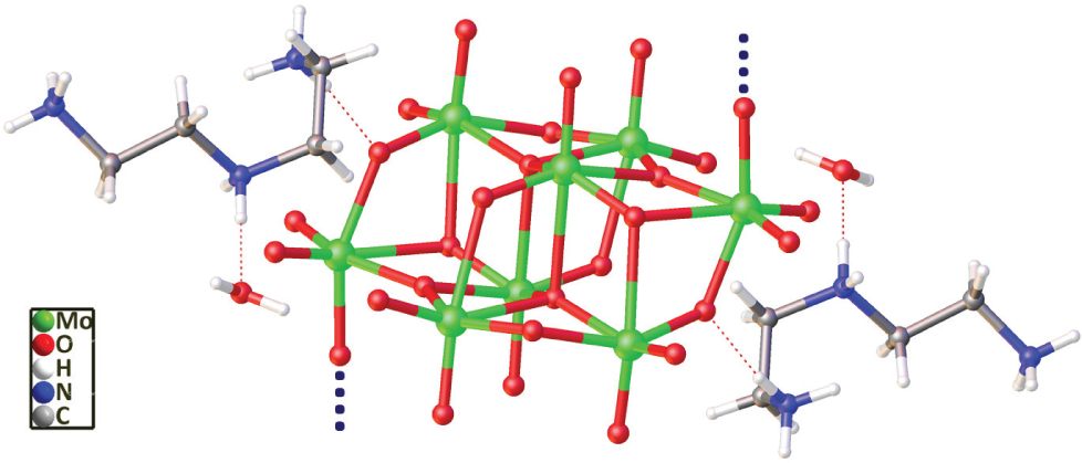 Herein, we report the structure of a one-dimensional octamolybdate, [(H3dien)2(Mo8O27) ⋅ 2 H2O]n (dien = diethylenetriamine). The asymmetric unit consists of one protonated [H3dien]3+cations, one half of an homopolymolybdate radical polyanion [Mo8O27]6− and one crystal water molecule. All Mo atoms are in a six-coordination state. The O atoms within the anion can be divided into four types in accordance to their bonding modes, namely, terminal, μ2, μ3- and μ4. All bond distances and angles are within the expected ranges. The structure is closely related to that of the bis(tris(2 ammonioethyl)amine analogue [11]. The shortest Mo—O distances range from 1.705(3) to 1.750(3) Å for terminal oxygen atoms (Mo—Ot). The O—Mo—O bond angles are in the range of 71.50(11)–177.44(13)°. Bond valence sum calculations [12] on the Mo sites afford 6.05, 5.97, 6.03 and 5.94 for Mo1, Mo2, Mo3 and Mo4 respectively. These calculation results reveal the symmetry-independent Mo sites are in the +6 oxidation state, as expected.