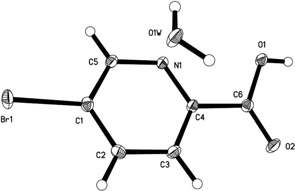 As shown in the figure, the asymmetric unit is made of one neutral 5-bromopicolinic acid molecule and one water molecule, given the molecule formula of C6H6BrNO3. All of the atoms are nearly co-planar, except the carboxyl group. The two C—O bond lengths from carboxyl group are 1.217 and 1.299 Å, indicating that the H atom from the carboxyl group is not removed. Furthermore, the refinement resulted that the N atom from the pyridine is not protonated and acts as an acceptor of the intermolecular O—H⋯N hydrogen bond. There is a dimer formed by two 5-bromopicolinic acid molecules which are bridged by two water molecules through two O—H⋯O hydrogen bonds. These dimers are linked with O—H⋯N hydrogen bonds to generate a hydrogen bonded strand, which runs along the crystallographic b axis. All bond lengths and angles of 5-bromopicolinic acid are comparable with its analogues [5], [6], [7], [8], [9], [10], [11].