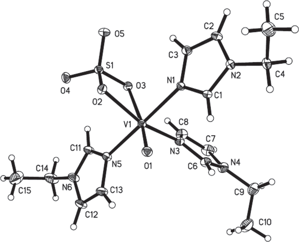 The central vanadium atom adopts a ‘4 + 1 + 1’ geometry formed by three N atoms from1-eIM, two bridging oxygen Ob from sulfate and one terminal oxygen Ot with the V—O and V—N bonds within the range of 1.597–2.186 Å and 2.082–2.125 Å, respectively [11]. The sulfate ligand is coordinated in a chelating bidentate mode with the S—O bonds within 1.448–1.518 Å. Although the central vanadium possesses distorted octahedral coordination geometry which is same to the previous reports in the similar system [12]. But in the previous reports, the four coordinated equatorial atoms are N atoms from 1-eIM. It is noteworthy that the 1-eIM plays a dual function as solvent and ligands.