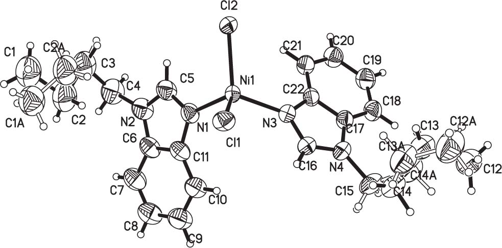 50. Crystal structure of dichloro-bis-(1-butyl-1H-benzo[d]imidazole)-nickel(II), C22H28Cl2N4Ni