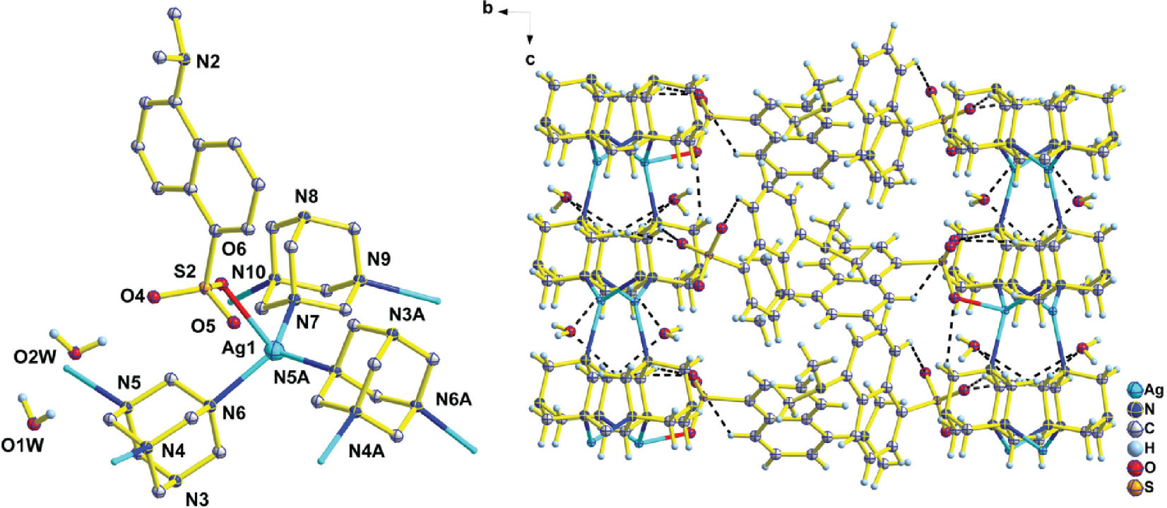 As is depicted in the left part of the figure, the Ag1 is four-coordinated by three nitrogen atoms and one oxygen atom. And three nitrogen atoms come from three hexamethylenetetramine ligands, one oxygen atom comes from 5-bimethylamino-1-naphthalenesulfonate. The bond distances of Ag—O and Ag—N are in the normal ranges. Additionally, there are two free water molecules. Most importantly, the weak interaction CH⋯O also plays an important role in forming a 3D structure [6-8] (cf. right part of the figure). (symmetry codes: A = −1/2 + x, 1/2 − y, z).