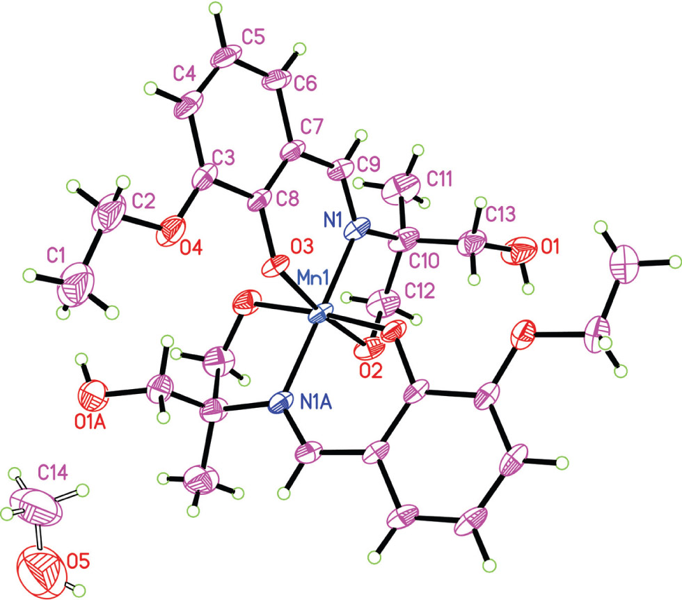 As shown in the Figure, the asymmetric unit of the title structure contains one half of the manganes complex (located on a twofold axis) and one half of methanol molecule (near a twofold axis). The bond lengths of Mn1—O2, Mn1—O3 and Mn1—N1 are 1.854, 1.889 and 1.976 Å, respectively, which are similar with the Ni complex [9]. In the Ni complex, the coordination environment is the same with the compound one.