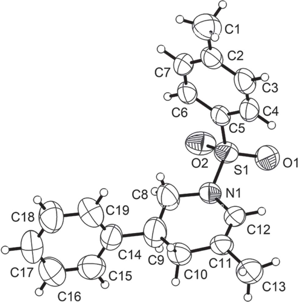 Home Crystal structure of 5-methyl-3-phenyl-1-tosyl-1,2,3,4-tetrahydropyridine, C19H21NO2S