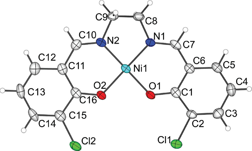 - Crystal structure of bis((3-chlorosalicylidene)-ethylenediaminato-κ4N,N′,O,O′)nickel (II), C16H12Cl2NiN2O2