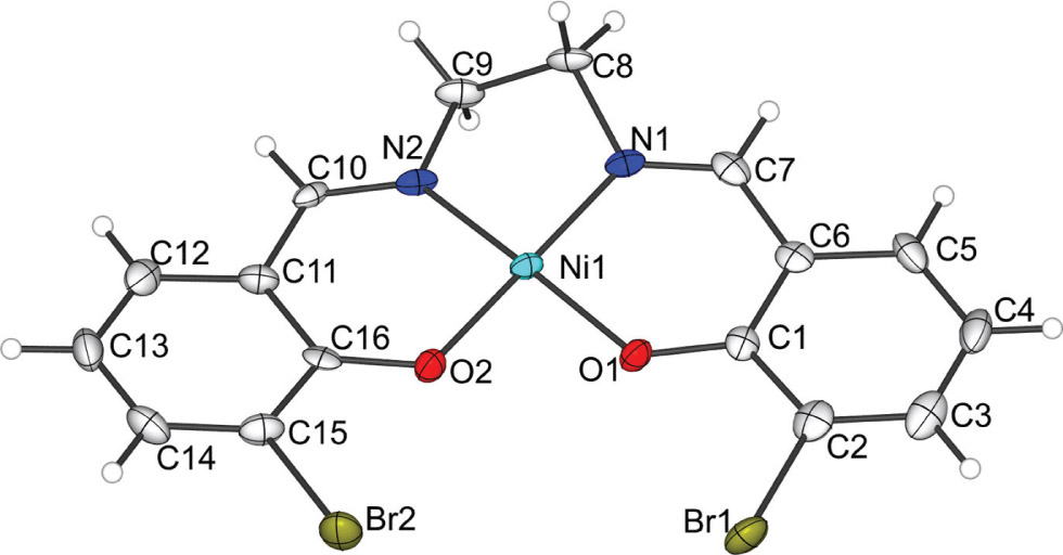 - Crystal structure of bis((3-bromosalicylidene)-ethylenediaminato-κ4N,N′,O,O′) nickel (II), C16H12Br2NiN2O2