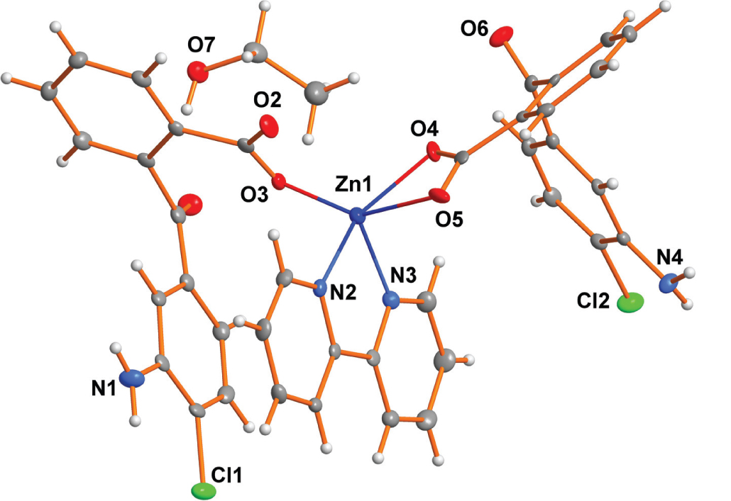 - The crystal structure 2,2′-bipyridine-κ2N,N′-(2-(3-amino-4-chlorobenzoyl)benzoato-κ1O)-(2-(3-amino-4-chlorobenzoyl)benzoato-κ2O,O′)zinc(II) — ethanol (1/1), C40H32Cl2N4O7Zn