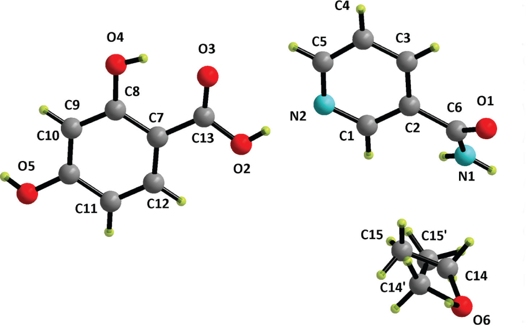 The asymmetric unit of the title structure comprises one nicotinamide, one 2,4-dihydroxybenzoic acid molecule and one disordered ethanol molecule (see the Figure). This co-crystal is isostructural to the 2,4-dihydroxybenzoic acid–nicotinamide-methanol co-crystal molecule [6], however, the large difference in structural parameters is still found. For example, the angle of C1—C2—C6—N1 twists more strongly [37.9(3)°]. The lengths of C—O and C—N bonds in the amide group are larger about 0.33 and 0.44 Å compared with its isostructural compound [6], respectively. The C—O bond lengths of 1.310(2) and 1.232(2) Å for the carboxylic acid group are more typical characteristics of an organic acid, revealing no proton transfer between nicotinamide and 2,4-dihydroxybenzoic acid.