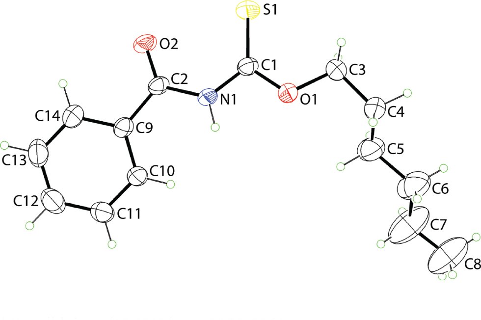 O-Hexyl benzoylcarbamothioate was prepared by reacting benzoyl chloride and potassium thiocyanate in acetone. The intermediate isothiocyanate obtained in situ was then reacted with hexan-1-ol to provide the desired thiocarbamate in 71% yield. Yellow solid. M.pt = 343–345 K, MeOH/H2O (lit. [6] M.pt = 343 K, EtOH/H2O). IR (KBr; cm−1): 3259, 3217, 3062, 2954, 2924, 2854, 1697, 1601, 1527, 1489, 1296, 1184, 710. 1H NMR (300 MHz, CDCl3, rotamers, 298 K, TMS): δ = 9.16 (br s, 1H), 7.82 (m, 2H), 7.59 (m, 1H), 7.48 (m, 2H), 4.58 (t, J = 6.6 Hz, 2H), 1.82 (m, 2H), 1.60–1.20 (m, 6H), 0.90 (t, J = 6.6 Hz, 3H). 13C{1H} NMR (75 MHz, CDCl3, rotamers, 298 K, TMS): δ = 189.3, 162.2, 132.8, 132.7, 128.7, 127.4, 73.6, 31.3, 28.0, 25.4, 22.4, 14.0. MS (EI): m/z (rel. intensity) = 265(16) [M]+, 182(41), 123(32), 121(30), 105(100), 77(48), 56(24), 51(23). HRMS calcd. for C14H19NO2S 265.11365, found 265.11493. Yellow crystals were obtained by dissolving the product in hot n-hexane and allowing the solution to slowly evaporate.