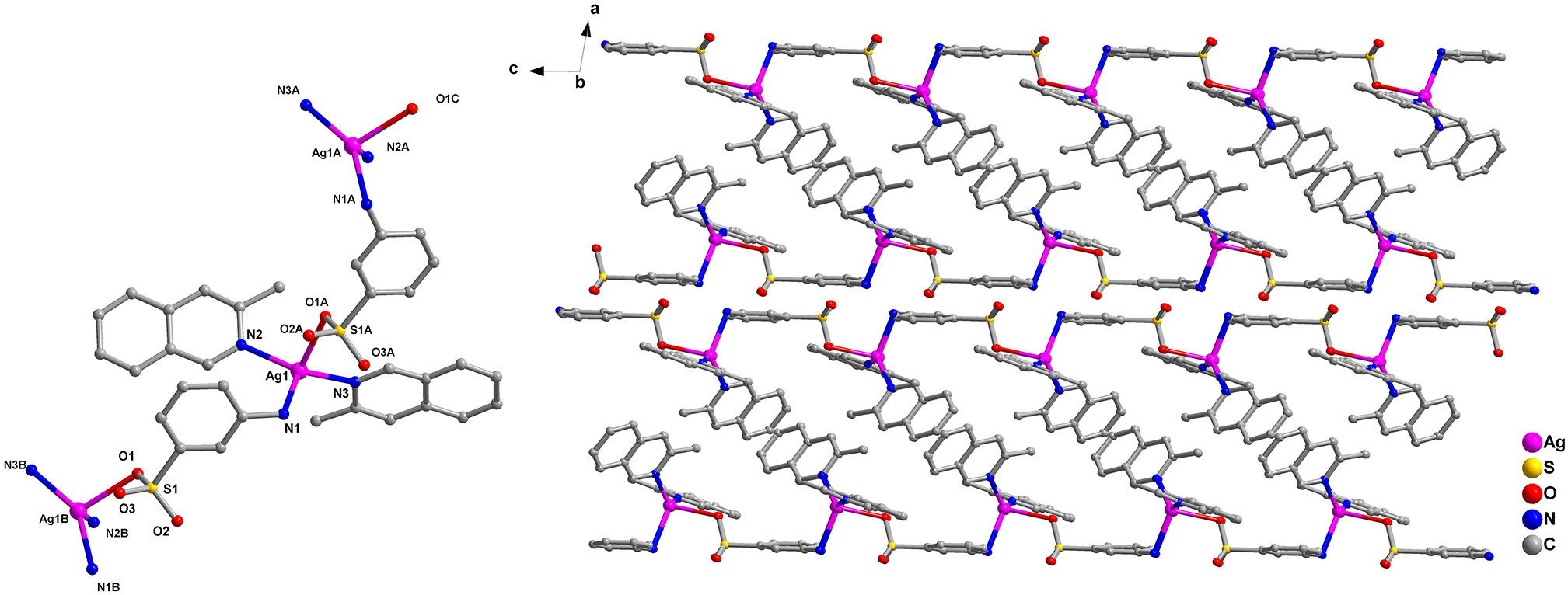 As is depicted in the left part of the picture, the Ag1 is four-coordinated by three nitrogen atoms and one oxygen atom. The two nitrogen atoms coming from two 3-methyl-isoquinoline ligands and one nitrogen atom coming from a 3-amino-benzenesulfonic acid (abeS) ligand. One oxygen atom of another abeS ligand is coordinated (left part of the figure). The bond distances of Ag–N range from 2.247(3) to 2.360(4) Å [6]. Its structure is one-dimensional chain, well known in this class of structures [7] (cf. right part of the picture). (symmetry codes: A = x, 1/2 − y, 1/2 + z; B = x, 1/2 − y, −1/2 + z; C = x, 1/2 − y, −1/2 + z).