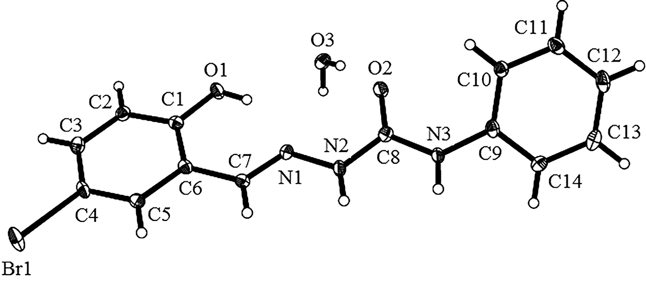 The molecular structure of the title compound is depicted in the Figure. The compound consists of one (E)-2-(5-bromo-2-hydroxybenzylidene)-N-phenylhydrazine-1-carboxamide molecule and one water molecule. The bond distances of C-N are 1.284(5) Å (C7-N1), 1.374(5) Å (C8-N2) and 1.421(5) Å (C9-N3), respectively. The bond distance of C7-N1 is shorter than those of C8-N2 and C9-N3, indicating the C7-N1 bond is a double bond. The dihedral angle between plane 1 (C1-C2-C3-C4-C5-C6) and plane 2 (C9-C10-C11-C12-C13-C14) is 47.8°. In the crystal packing, the hydrazone molecules form a 3D network by intermolecular N-H…O, O-H…N and O-H…O hydrogen bonds.