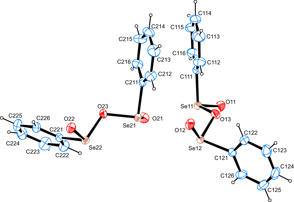 The structure solution shows the presence of two complete molecules of the title compound in the asymmetric unit. Se–O bond lengths for the formal Se=O double bonds cover a narrow range of only 1.635(2)–1.648(2) Å as well as an equally small range of 1.818(2)–1.843(2) Å for the Se–O single bonds. C–Se bonds are found in between 1.920(3)–1.932(3) Å. All mentioned atomic distances are in good agreement with corresponding values reported for comparable compounds as found in the Cambridge Structural Database [18]. The least-squares planes as defined by the non-hydrogen atoms of the aromatic moieties within the two individual molecules enclose angles of 48.1(2)° and 68.76(19)°, respectively.