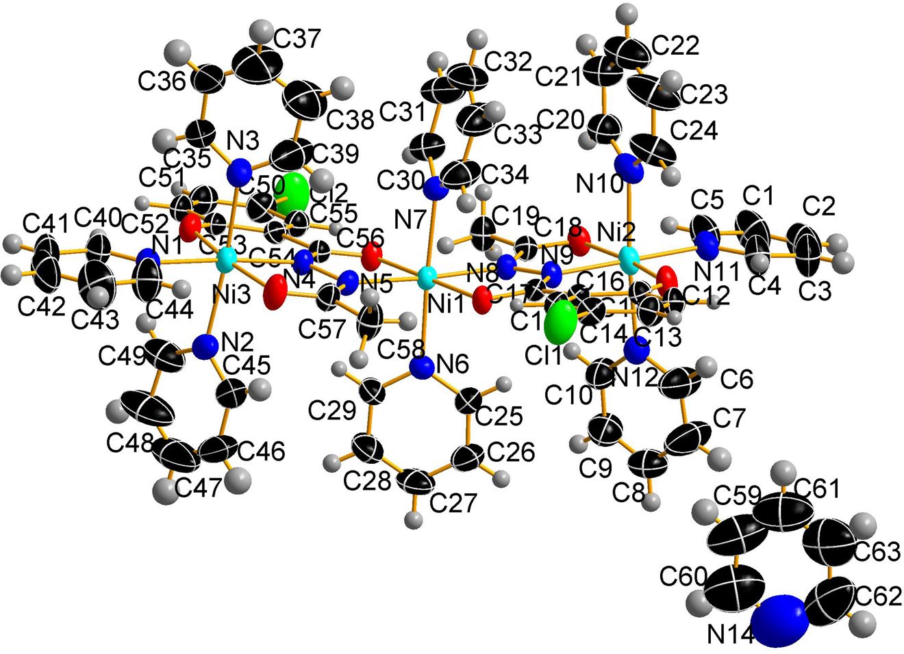 As shown in the Figure, the title compound crystallizes in the monoclinic space group P21/c with four formula units in the unit cell. The bond lengths of Ni–O are 2.030, 2.000, 2.035, 2.003 and 2.049 Å, the bond lengths of Ni–N are 2.081, 2.091, 2.165, 2.174, 1.976, 2.105, 2.211, 2.215, 1.978, 2.108, 2.193 and 2.198 Å, respectively, the bond lengths of Ni–N from the pyridine molecule is longer than the bond lengths of Ni–N from the anionic ligands, which are similar with the reference [8]. The trinuclear complex is almost centrosymmetric but this symmetry is not supported by the crystallographic findings. The Ni complex is formed by two chelated ligands three nickel ions and eight pyridine molecules. We can see that each nickel ion resides in a slightly distorted octahedral coordination environment, consisting of three pyridine N, a phenolate O, a carbonyl oxido O and an imine-type nitrogen of L, which construct the five-membered and six-membered rings with each nickel atom.