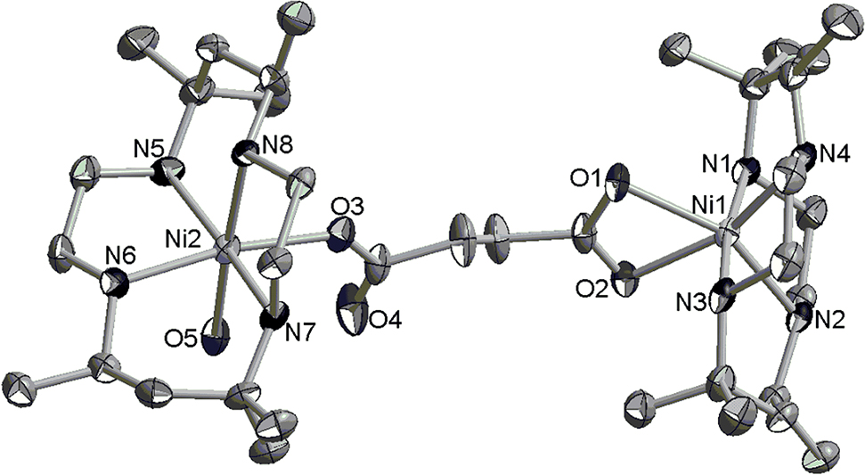 In contrast to similar structures [5], [6], each Ni(II) atom displays a six-coordinate octahedral coordination geometry by coordination with four nitrogen atoms from macrocyclic ligand in a folded conformation, plus three oxygen atoms from the succinato ligand (see the figure). The Ni–N bond lengths [2.084(3)–2.164(3) Å] are close to the Ni–O bond lengths [2.057(3)–2.187(3) Å].