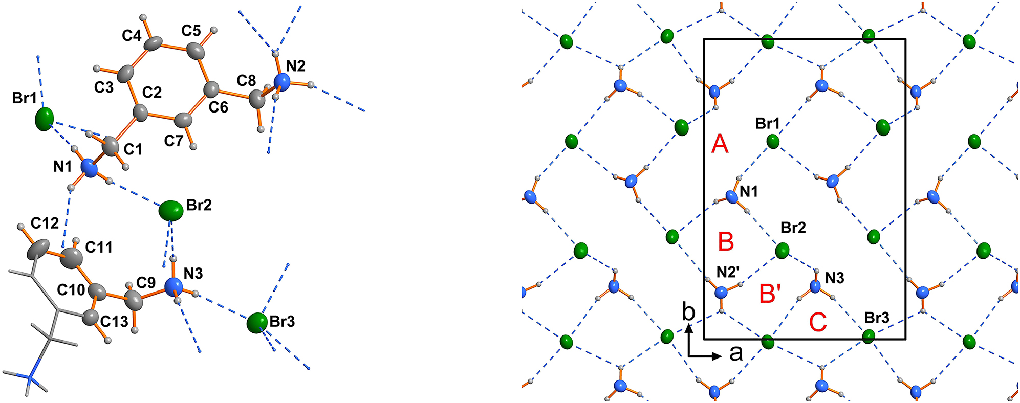 Cations and anions are connected via NH⃛Br hydrogen bonds (see the Figure). Each –NH3 group donates at least three hydrogen bonds and each bromide anion accepts at least three of them. All Br⃛H distances are significantly below the typical van der Waals distances [23]. These hydrogen bonds construct a 2D-network in the ab plane. In this network three different ring types (right part of the Figure) can be assigned {graph set descriptors [24]: A: