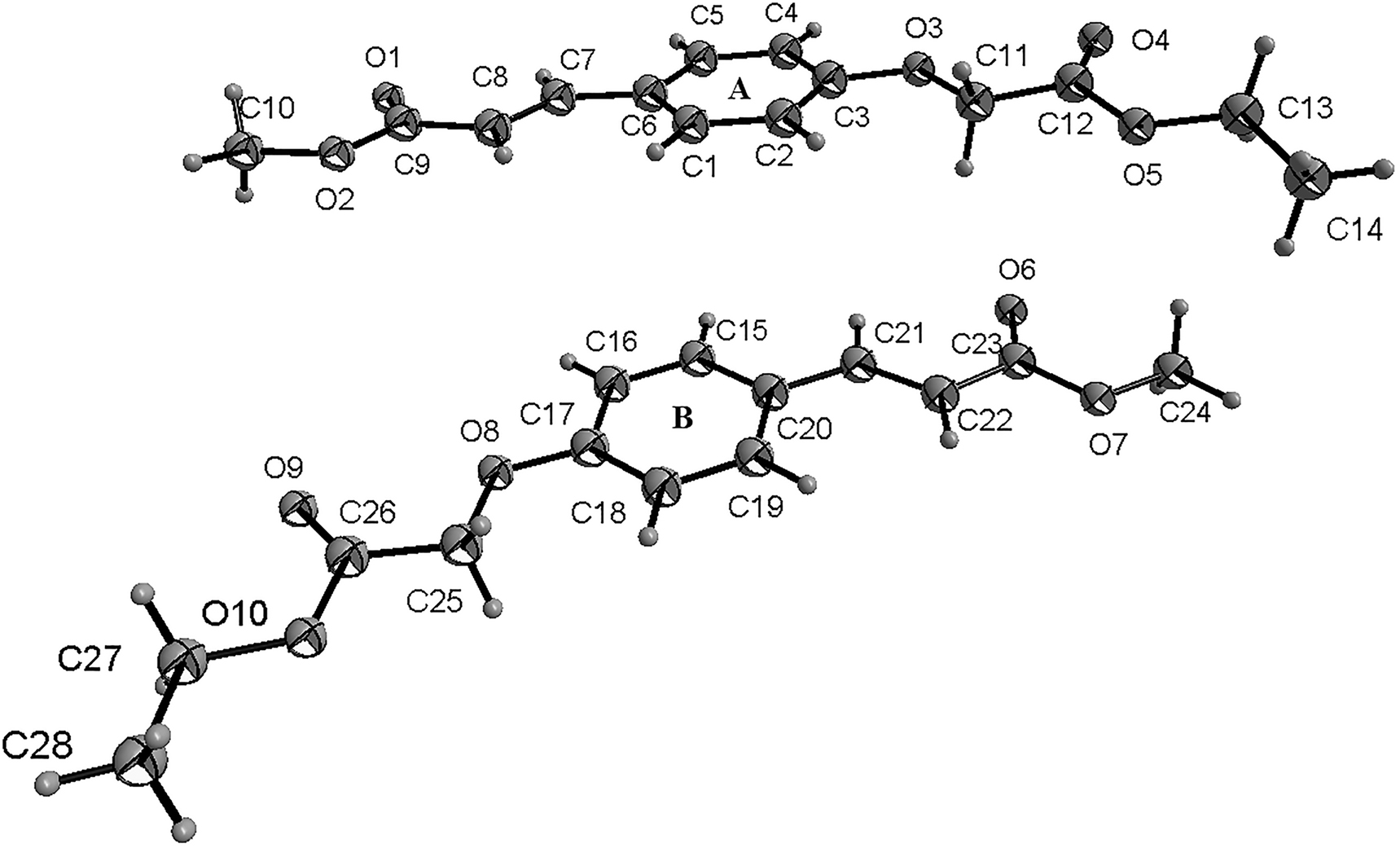 There are two crystallographic independent molecules in the asymmetric unit (shown in the figure). In the molecules of the title structure bond lengths and angles are very similar to those given in the literature for p-coumaric acid derivatives [17], [, 18]. In the title structure, the parts of methyl p-coumaric acid of molecule A and B were approximately planar. The dihedral angles of molecule A formed by the C1–C6 plane, the carboxylate group O1–C9–O2 plane and the carboxylate group O4–C12–O5 plane were 5.0°, 10.1° and 14.6, respectively, while the dihedral angles of molecule B formed by the C15–C20 plane, the carboxylate group O6–C23–O7 plane and the carboxylate group O9–C26–O10 plane were 6.5°, 6.1° and 1.1°, respectively.