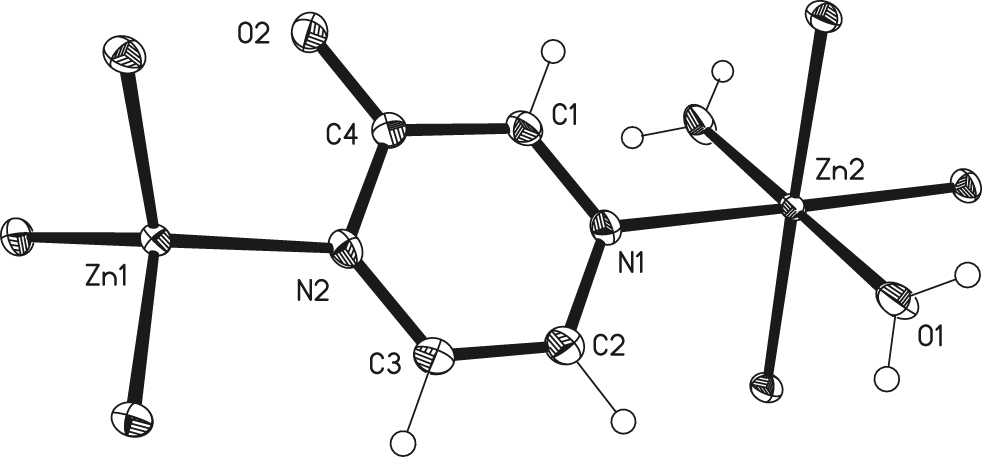 Pyrazine molecules have a high symmetry. The N electronegativity and aromaticity of the molecules makes pyrazine the small, convenient and flexible molecule or group for the construction of metal complexes. Studies have shown that pyrazine can form coordination polymers with multi-dimensional network structure [7]. Compared with pyridine heterocycles, pyrazine has more active sites to form hydrogen bonds and coordination bond. When substituents are introduced into pyrazine heterocycles, it is speculated that new hydrogen bond active sites may be formed according to the charge distribution of organic molecules [8]. We recently investigated the formation of a zinc complex containing pyrazine groups by hydrothermal in situ reaction with transition metal self-assembly using 2,2′-di(pyrazine2-yl)-[4,5′-biisoindoline]-1,1′,3,3′-tetraone as a precursor. Here we report the three-dimensional structure of [Zn(2-pyz)2(H2O)]n (1) (2(1H)-pyz = 2(1H)-pyrazinone).