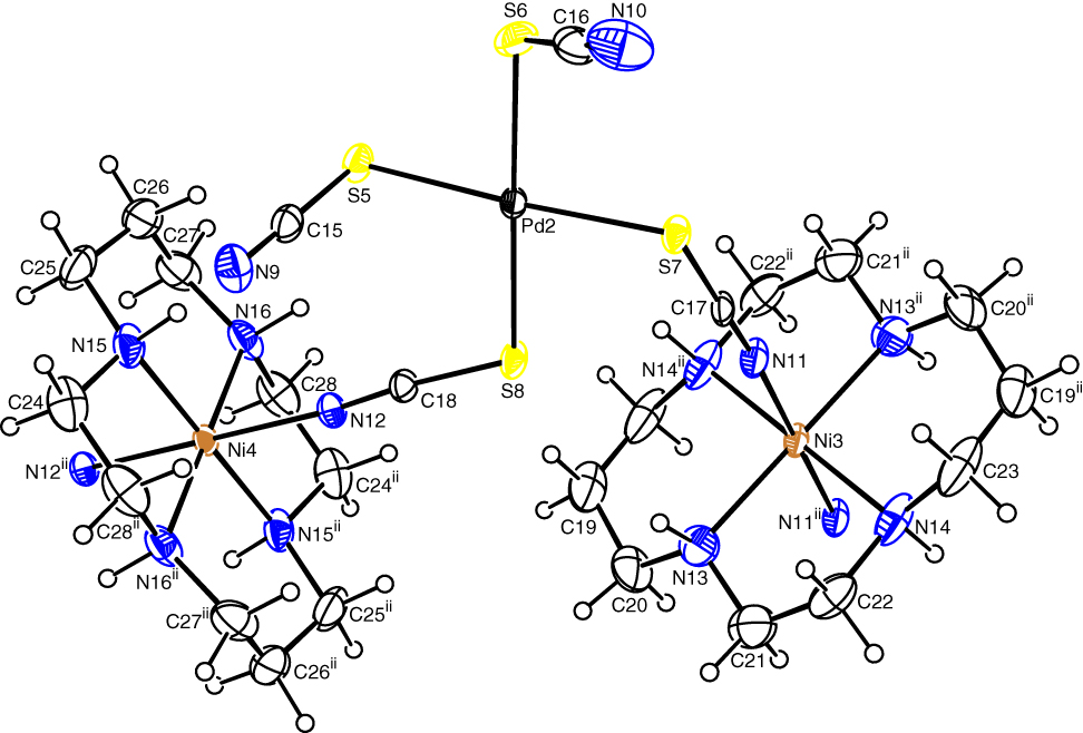 - Crystal structure of catena-poly[(1,4,8,11-tetraazacyclotetradecane-κ4N,N′,N″,N′′′)-bis(μ2-thiocyanato-κ2N:S)-bis(thiocyanato-κS)-nickel(II)palladium(II)], C14H24N8NiPdS4
