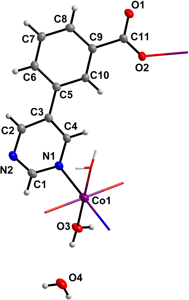 6. Crystal structure of poly[diaqua-bis(μ2-3-(pyrimidin-5-yl)benzoato-κ2N:O)cobalt(II)] dihydrate, [Co(C11H11O2N2)2(H2O)2]