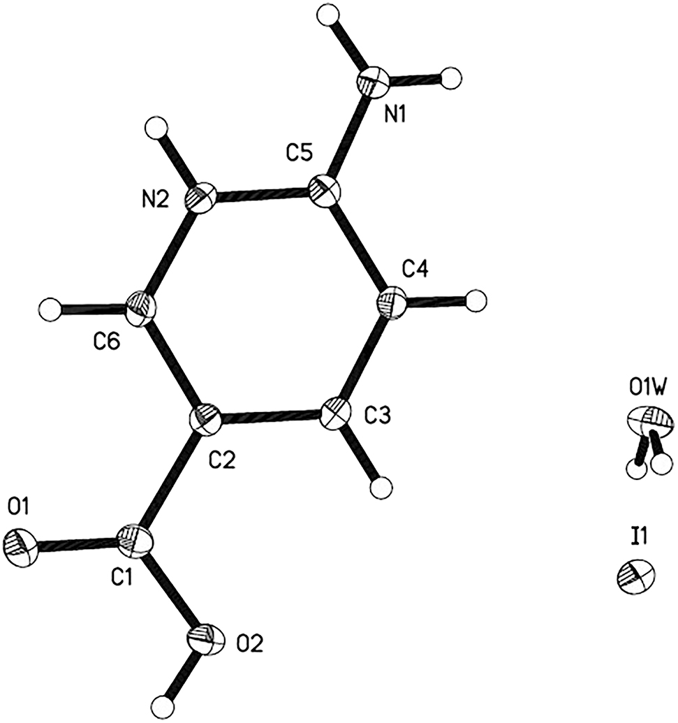 The 6-amino-nicotinic acid was used as a bifunctional ligand for Zn(II), Mn(II) and Co(II), Cd(II), and Ca(II) and Sr(II) to construct coordination polymers and metal-organic frameworks [5], [6], [7], [8], [9]. There also have been some salts of it such as its chloride, bromide, nitrate and dihydrogen phosphate [10], [11], [12] which are based on the monoprotonated cation of 6-amino-nictotinic acid. However, the crystal structure of it’s iodide has not been reported.