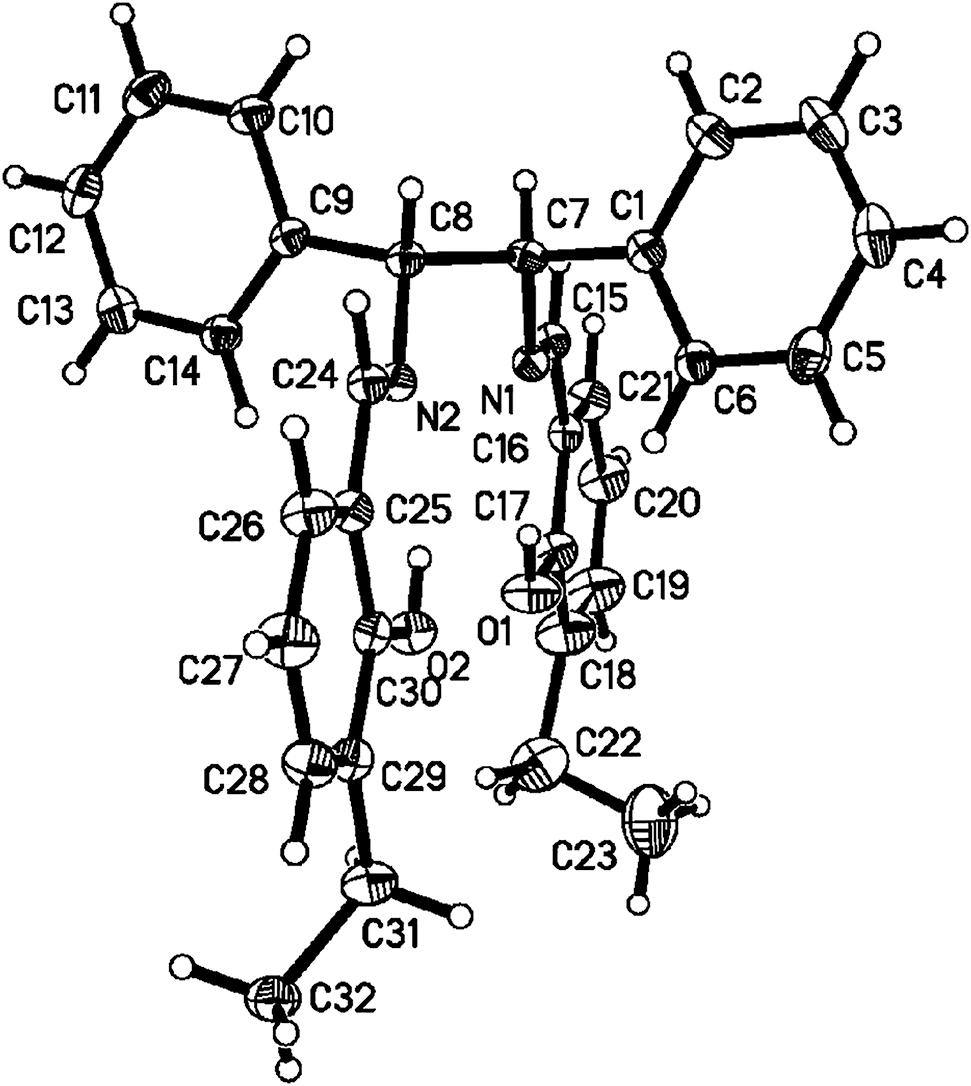 Home Crystal structure of 6,6′-((1E, 1′E)-(((1R, 2R)-1,2-diphenylethane-1,2-diyl) bis(azanylylidene))bis(methanylylidene))bis(2-ethylphenol), C32H32N2O2