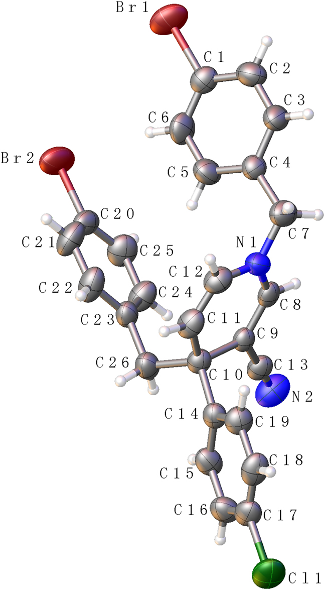 Dissolve 3-cyanopyridine 4.16 g (40 mmol) in acetonitrile (40 mL), add 4-bromobenzyl bromide (40 mmol), and reflux the mixed system for 7 h. TLC monitors the end of the reaction. After the reaction is over, use acetonitrile (30 mL) to wash the product to obtain a white powder pyridine salt. Add 1-(4-bromobenzyl)-3-cyanopyridin-1-ium (10 mmol) to the reaction flask, add 70 mL of anhydrous tetrahydrofuran to obtain a suspension. At this time, avoid light on an ice bath, add 0.5 mmol CuI while stirring, add 10 mL of 4-chlorophenyl magnesium bromide under nitrogen – after 2 h, TLC analysis indicated the reaction was complete. Brine was then added, and the mixture extracted with ethyl acetate. The combined ethyl acetate layers were dried over magnesium sulfate. Finally, the obtained solution was evaporated to dryness in vacuum, and recrystallized from methanol to obtain the material for the next step [4], [5]. The 1-(4-bromobenzyl)-4-(4-chlorophenyl)-1,4-dihydropyridine-3-carbonitrile (5 mmol) was dissolved in dry tetrahydrofuran (30 mL) under stirring, placed in a quartz reactor and degassed. At room temperature, the light source (10 W, 410 nm, LED lamp) was 60 cm away from the sample. After 48 h, TLC analysis indicated the reaction was complete. The target derivative was formed, and the reaction solvent was removed by rotary evaporation. The silica gel column chromatography was used to obtain the title compound with high purity.
